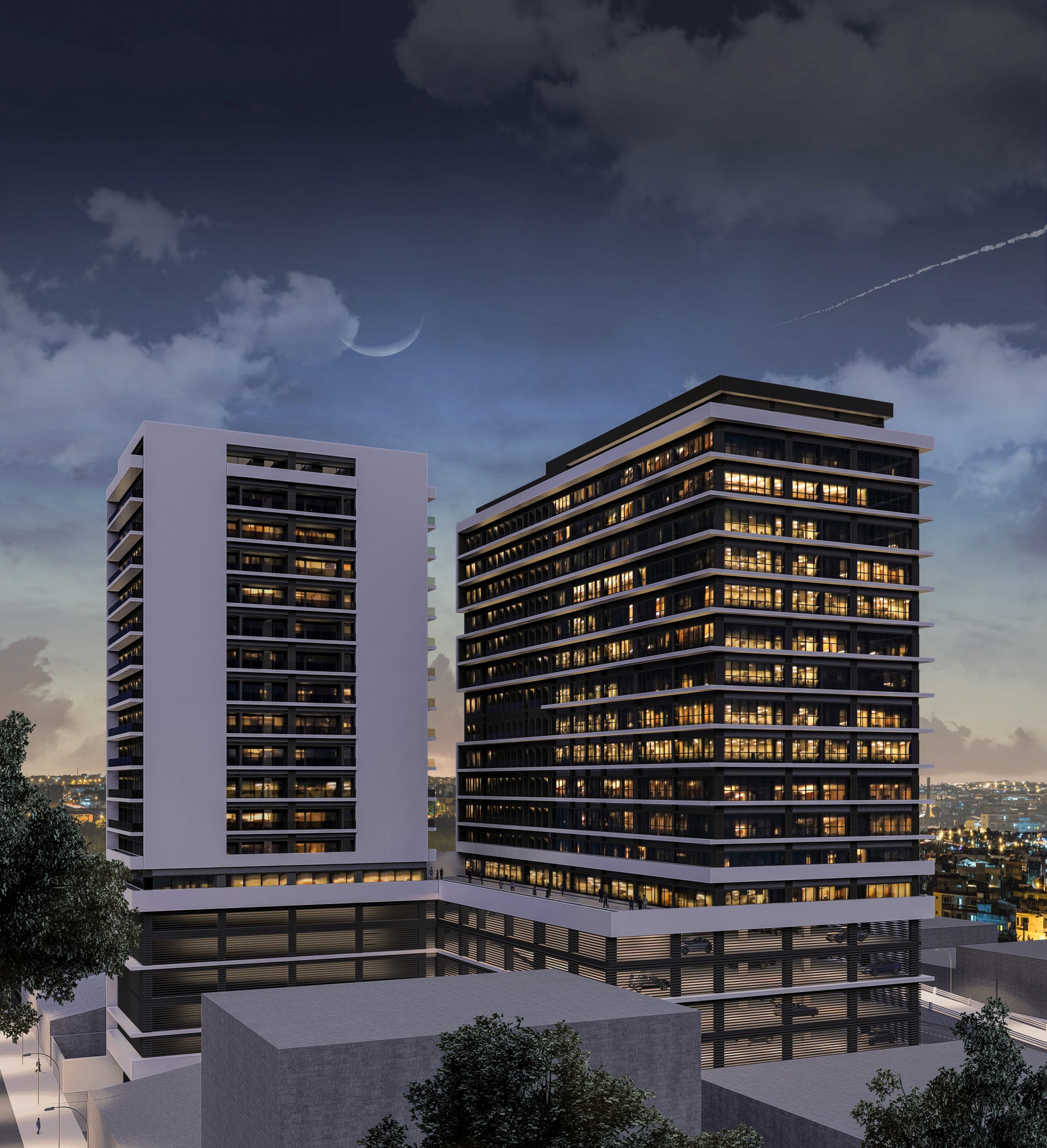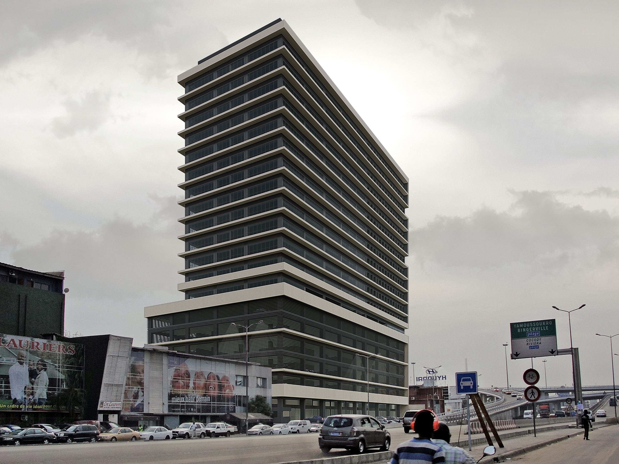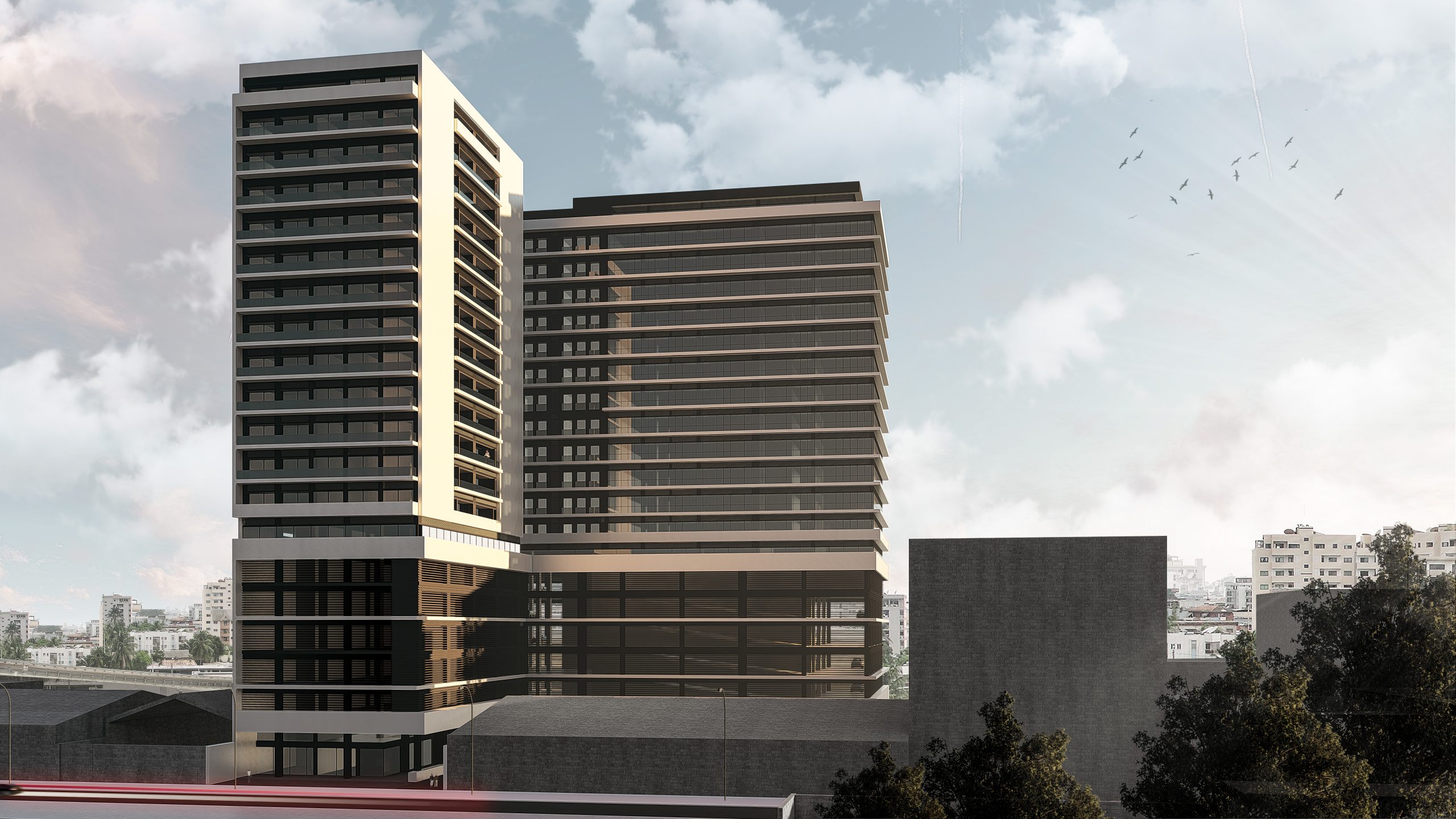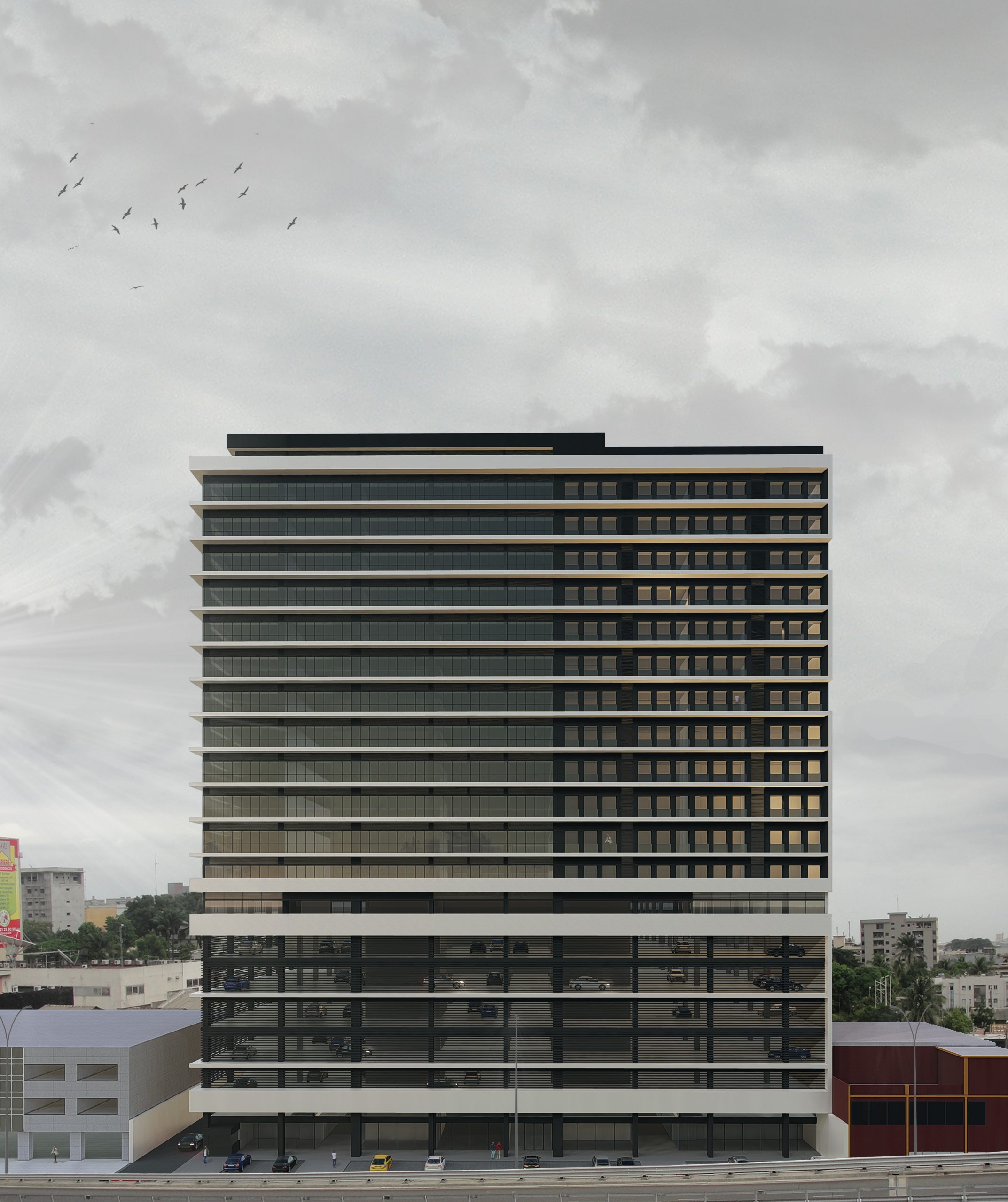 Located in the heart of Abidjan, next to one of the main roads in the city, this great project appears, divided into 2 large blocks with more than 15 floors. Its vast program consists of 96 offices, 38 apartments, 15 stores, 96 apartments for an Aparthotel, 1 Restaurant, 1 Gym, 5 Conference Rooms, Rooftop Pool and Parking for 350 vehicles.